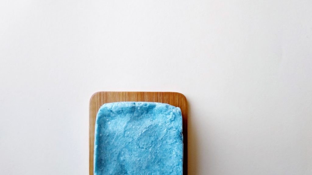 Antes de nada, tenéis que haceros con una mascarilla para protegeros del polvo del SCI. Comenzar fundiendo al baño maría el SCI, el BTMS, el cocoglucósido, junto con el aceite de coco y la glicerina. El BTMS cuesta de fundir, de modo que hay que verificar bien antes de retirar del fuego. Una vez fundido y fuera del calor, integrar la espirulina, el gel de áloe vera, la harina de avena y por último las vitaminas, el aceite esencial y el sharomix. Enmoldar inmediatamente. Dejar solidificar durante 24 horas (también podéis acelerar el proceso metiéndolo en la nevera por unas 3 horas). Pasado ese tiempo, ya podréis disfrutar a tope de vuestro champú azul molón.